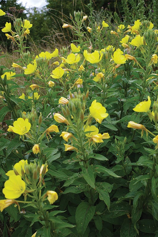 Evening primrose (Oenothera biennis) is often considered an annoying weed at best and an invasive at worst. It occupies the ditches along the roads, first as a rosette and then as a towering beast, reaching up to 8 feet with an explosion of flowers erupting from the top. Evening Primrose favors disturbed areas and has an incredible capacity to cover extended patches of bare ground aggressively. This is partly because of its unique seed survival—there is documentation of evening primrose seed being viable for one hundred years or more.1