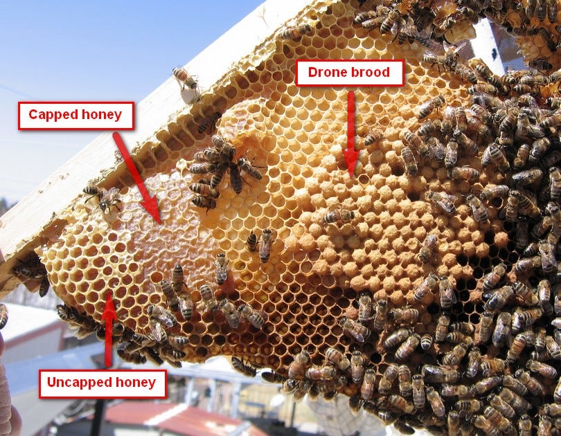 Now, to transition back to the drones themselves, we can take advantage of understanding how drones exist in a hive to track and even eliminate Varroa mites without the use of literally anything. Kim Flottum, a prominent bee author and researcher, has a system he uses for keeping his bees from ever having mite issues. It’s fairly simple if you understand how beehives work. So we mentioned before how drones exist on the edge of the hive, especially when they’re in the comb, right? Well, what he’s discovered is that if you put in new frames with no comb on the edges of your mediums. He uses the second and 6th frames, which in an 8-frame medium are 2 in from each side. Every week you put a new one in, so the first week, the bottom medium will have the 2nd frame replaced. The next week the bottom medium will have the 7th. The third week the middle medium 2nd frame was replaced, and so on. After about 3 weeks, you’d pull the first frame you put in to see what they’d built out for comb and inspect the drone larvae for signs of mites.